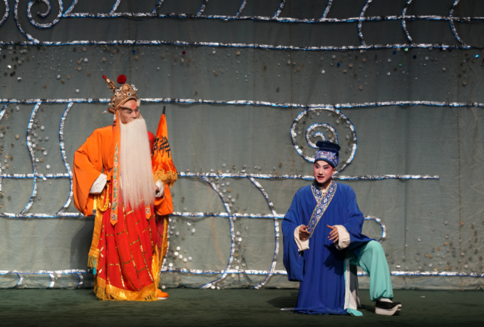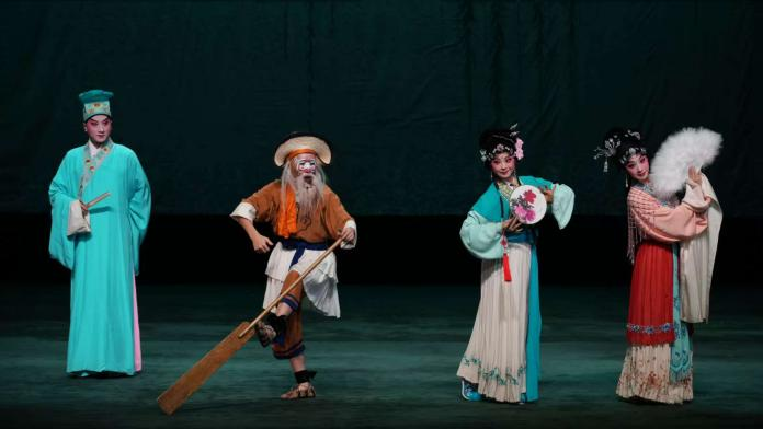 《船舟借伞》一折中,青儿以活泼可爱的形象出现,与艄翁一道打趣逗乐,爲白素贞和许仙的情缘牵线搭桥,这折戏中白蛇的娇、青蛇的俏、许仙的憨、艄翁的逗都在戏曲无水行舟的程序表演中,把四川人的机智、幽默、风趣、豁达展现的淋漓尽致。